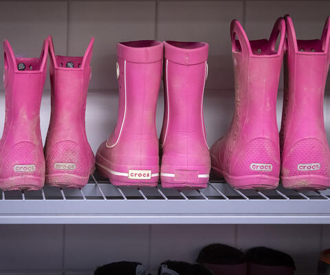 Erilaisia pinkkejä saappaita rivissä kenkätelineellä.