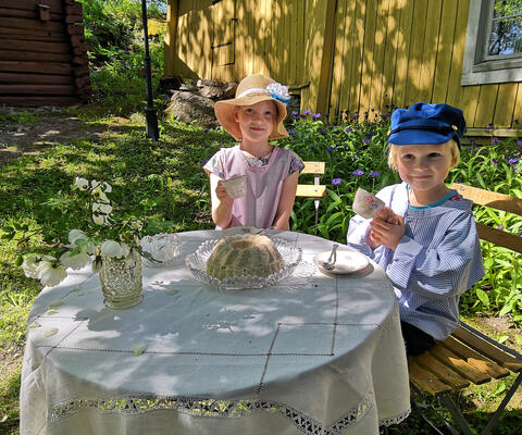 Museon pihalla vietetään lasten museopäivää, jolloin tyttö ja poika vanhan ajan vaatteisiin pukeutuneina juovat kahvia katetun pöydän ääressä.