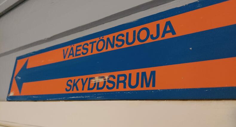 Sinisen ja oranssin värinen tarra, jossa lukee Väestönsuoja, oven yläpuolella