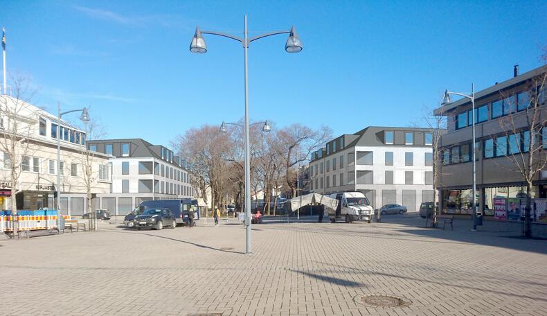 Birgitan talo vasemmalla nähtynä Naantalin torilta, kaavoittajan näkemys.