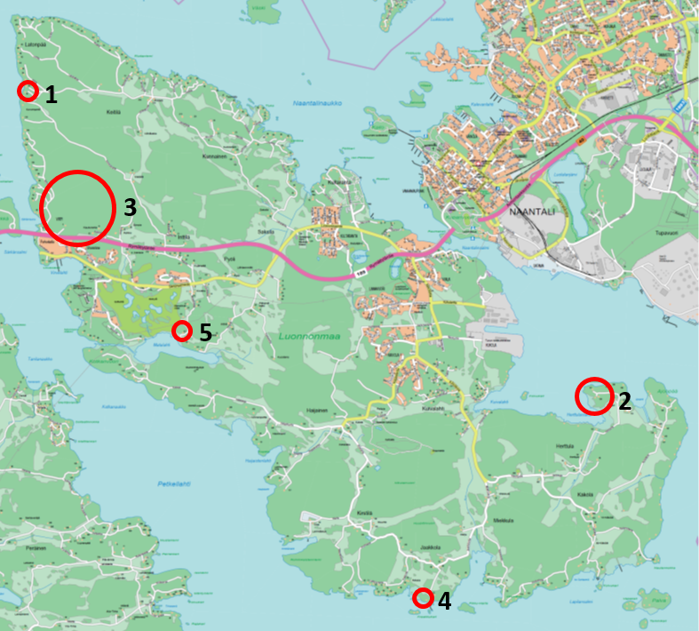 Luonnonmaan ja Lapilan ym. saarien osayleiskaavan muutos I, viiden muutosalueen sijainnit
