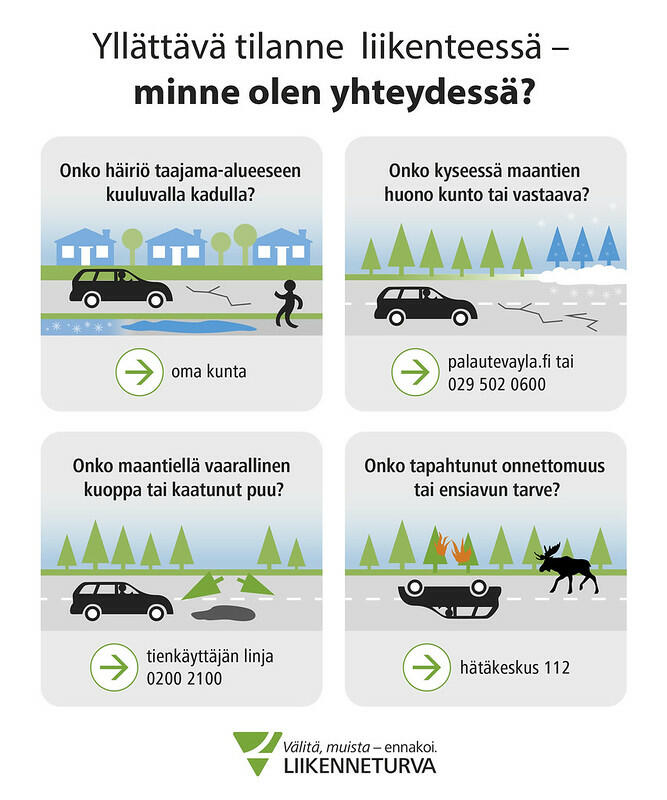Yllättävä tilanne liikenteessä - minne olen yhteydessä? 1. Onko häiriö taajama-alueeseen kuuluvalla kadulla? Oma kunta. 2. Onko kyseessä  maantien huono kunto tai vastaava? palautevayla.fi 3. Onko maantiellä vaarallinen kuoppa tai puu? Tienkäyttäjän linja 0200 2100. 4. Onko tapahtunut onnettomuus tai ensiavun tarve? Hätäkeskus 112.