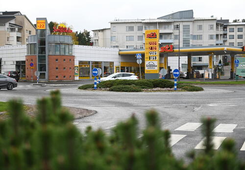 Aurinkotien risteysalueella Naantalin keskustassa henkilöautoja ja mopoilija liikenteessä.