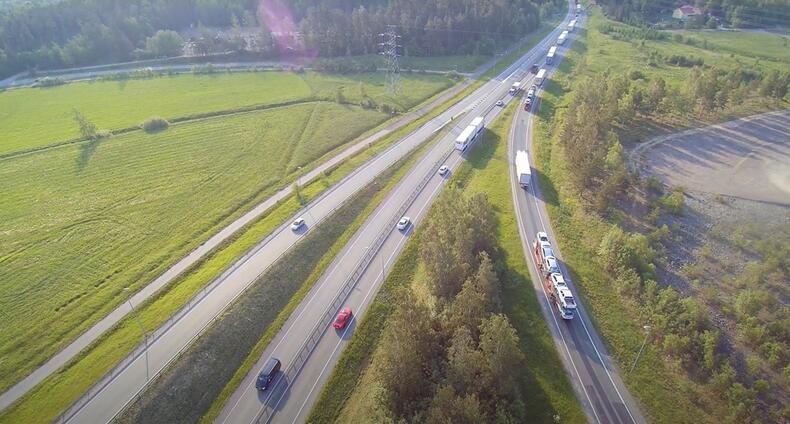 Ylhäältä kuvattuna näkyy E18-tie, jossa rekat ja autot ajavat. Kaistoja liittyy tiehen, ympärillä on vehreää pelto- ja metsämaisemaa.