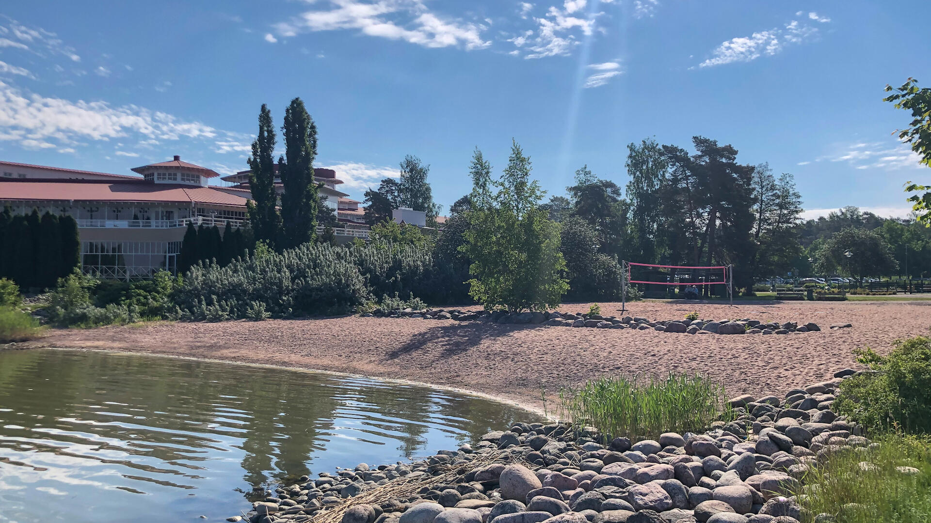 Etualalla kiviä ja nurmikkoa, keskellä avautuu pieni poukama, jossa hiekkaranta. Takan näkyy puita ja Naantalin kylpylän punakattoinen rakennus.