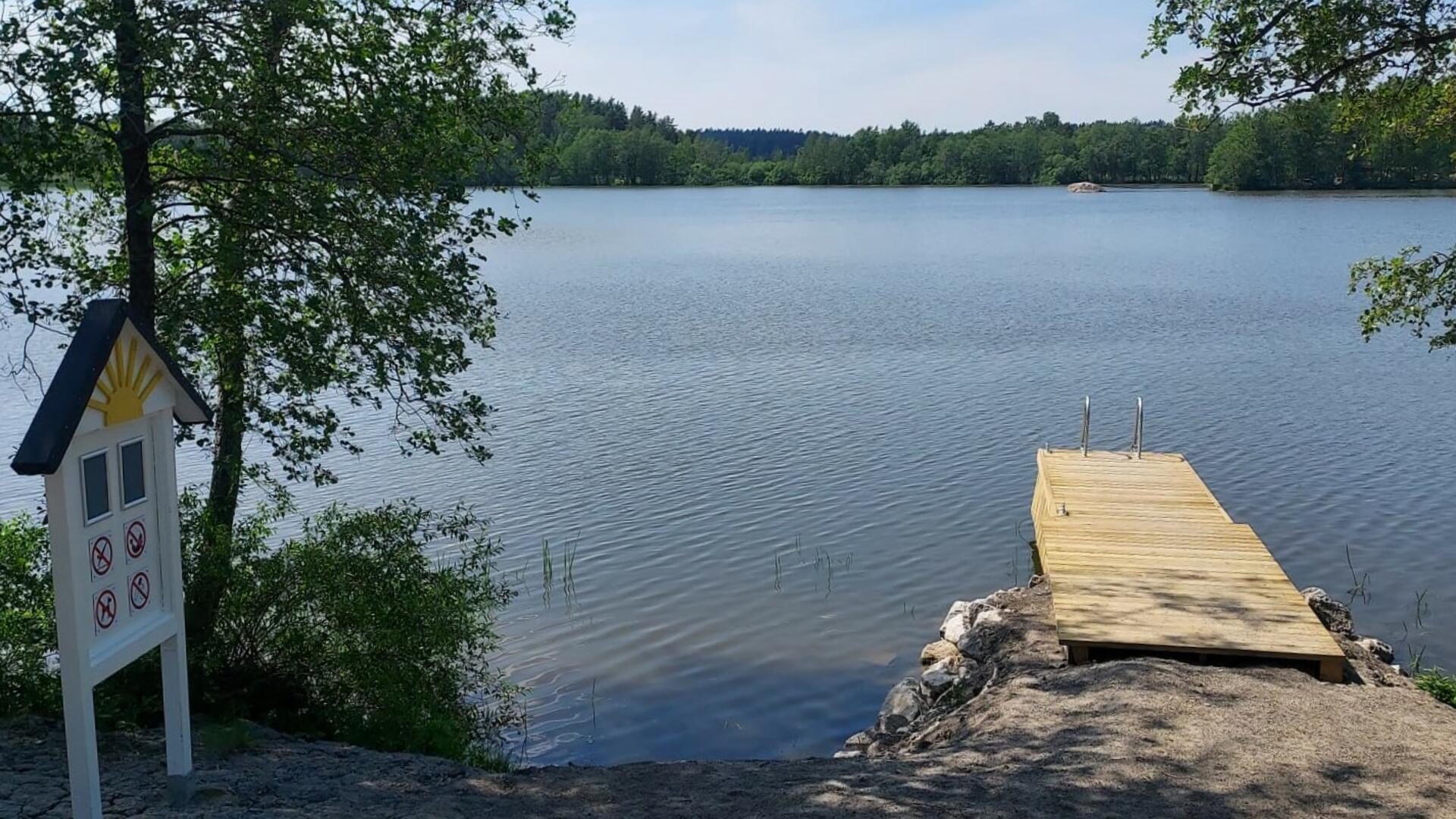 Laituri järven rannalla, vasemmalla kyltti uimapaikasta.