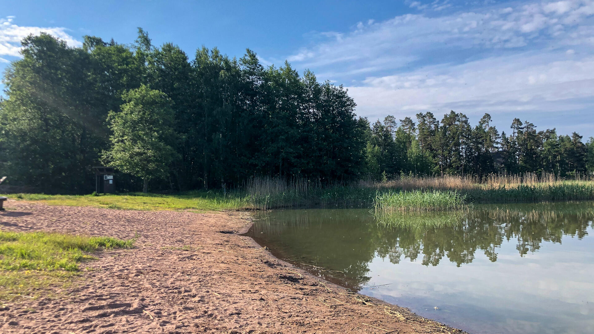 Hiekkaranta vasemmalla, meri oikealla, taustalla metsää. Aurinkoinen päivä.