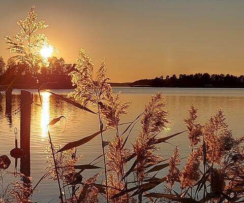 Ruovikon kukinnot tyynen meren rannassa ilta-auringossa.