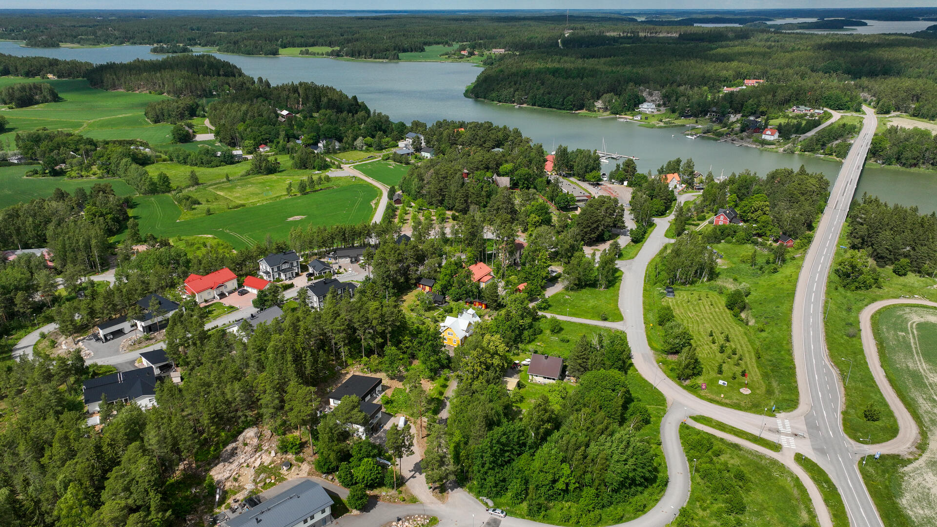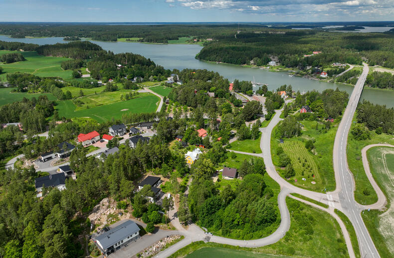 Asuinaluetta Merimaskun kirkonkylän tuntumassa, oikealla kulkee Merimaskuntie ja edessä Kirkonsalmi.