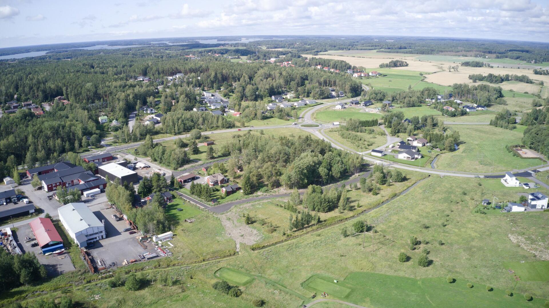 Etualalla nurmialuetta, keskellä pieni metsäalue, jonka keskeltä kulkee uusi tie. Ympärillä erilaisia kiintestöjä, etenpänä metsää.