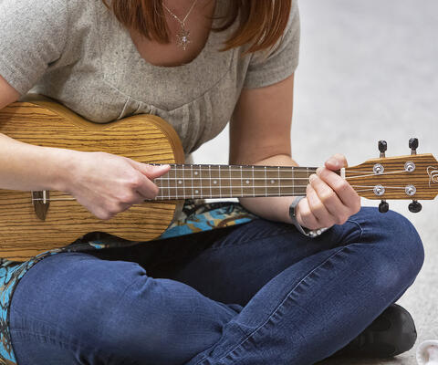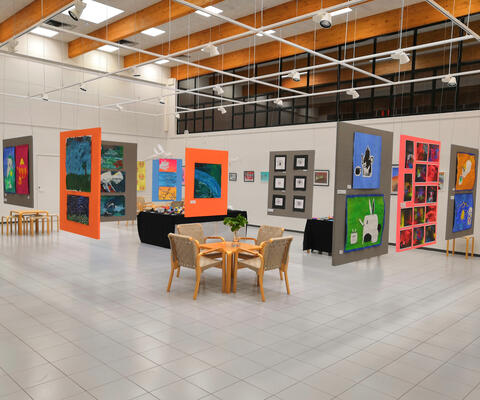 Birgitta-sali, jossa Naantalin opiston oppilastöitä on ripustettu seinille ja roikkumaan katon valaisinkehikosta.