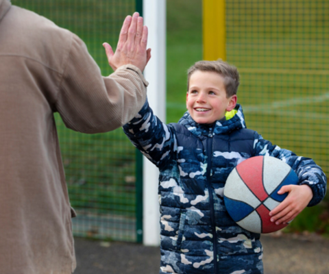 Lapsi, jolla on pallo kainalossa ja aikuinen antavat ylävitoset
