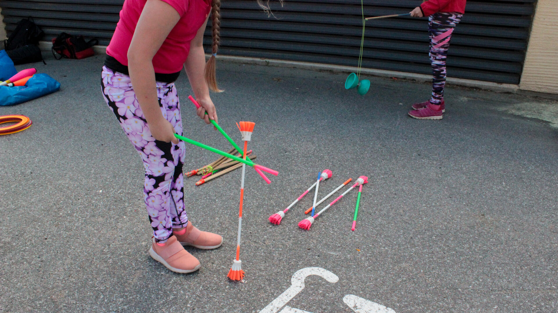 Värikkäästi pukeutunut lapsi pyörittelee käsissään värikkäitä sirkusvälineitä.