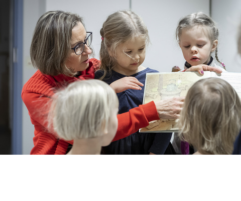 Lapset ja lastentarhanopettaja tutkivat kirjaa