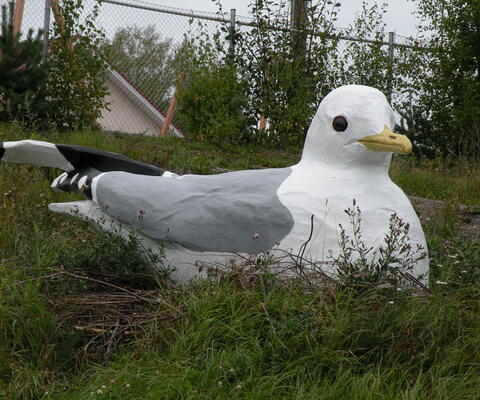 Lokkia esittävä taideteos Merimaskun koulun tienristeyksessä