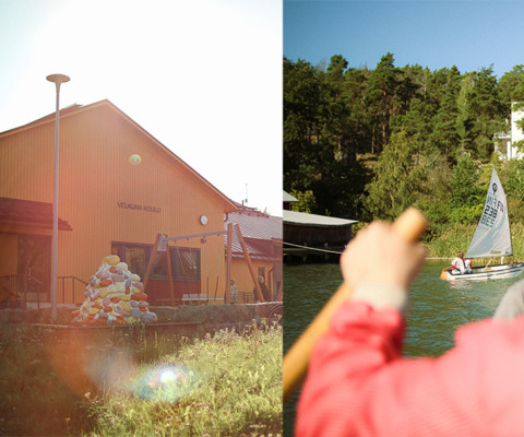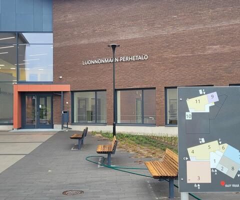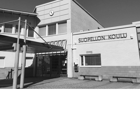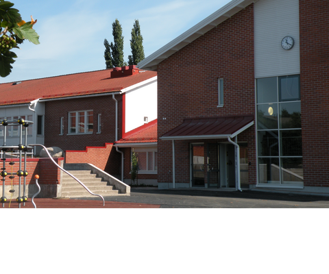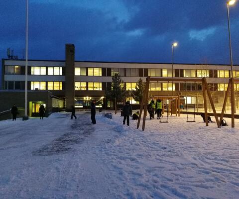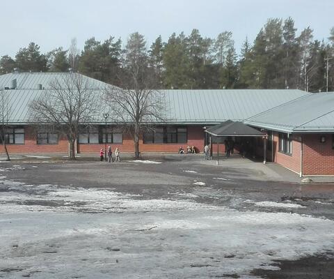 Leikkikentän päässä näkyy Lietsalan koulun keltainen, sininen ja punatiilinen rakennus.