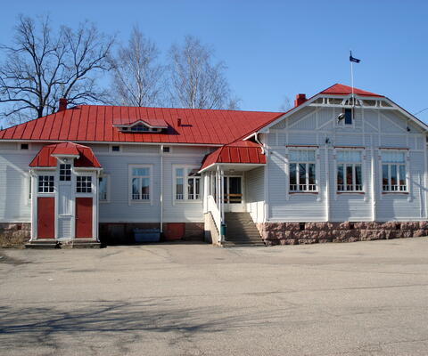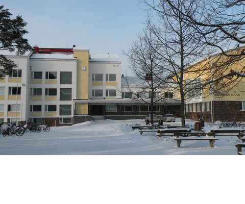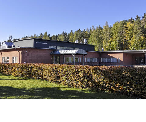 Rymättylän koulu on yksikerroksinen laaja rakennus. Aurinkonen maaliskuun päivä vuonna 2019.