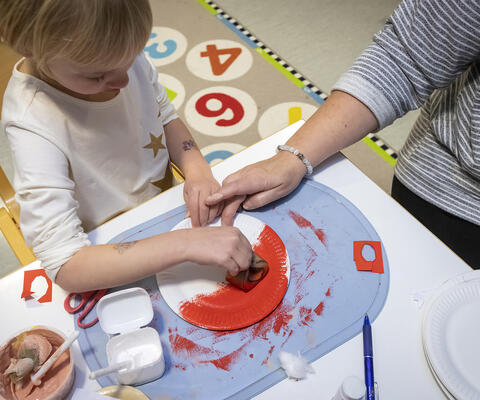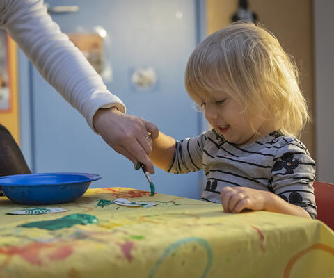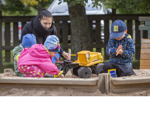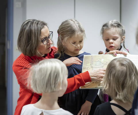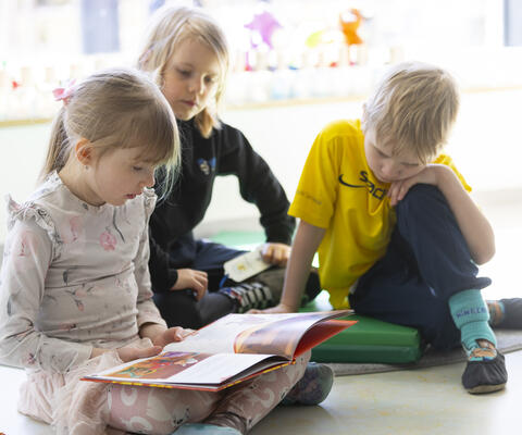 Varhaiskasvatuksen opettaja näyttää kirjaa lapsille.