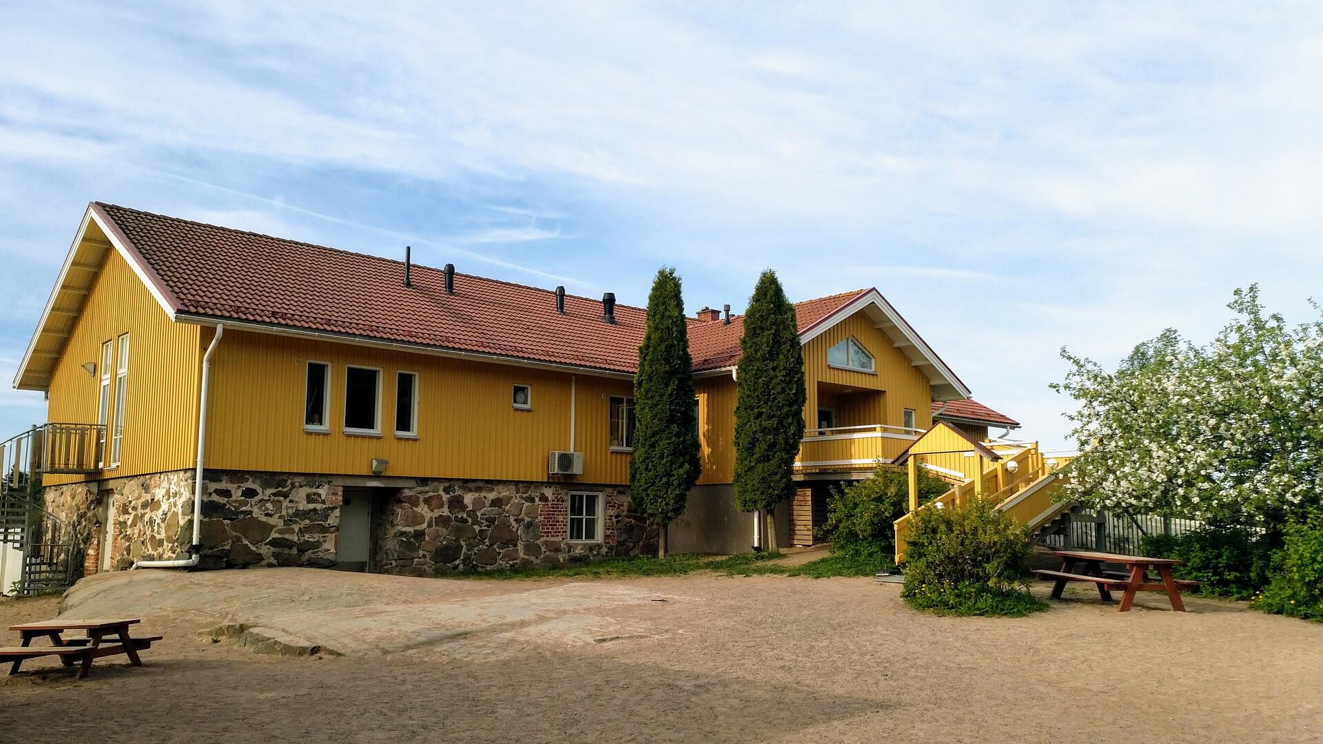 Viialan päiväkoti, oikealla puolella kukkiva omena puu j´sekä pöytä ja tuolit