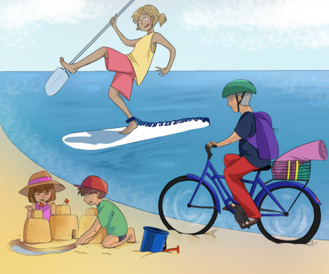 rannalla rakennetaan hiekkalinnaa ja suppaillaan sekä pyöräilllään