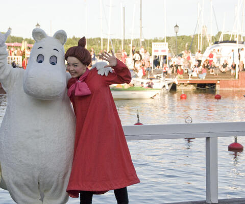 Muumipeikko ja Pikku Myy vilkuttavat Vanhankaupungin rannan laiturilla.