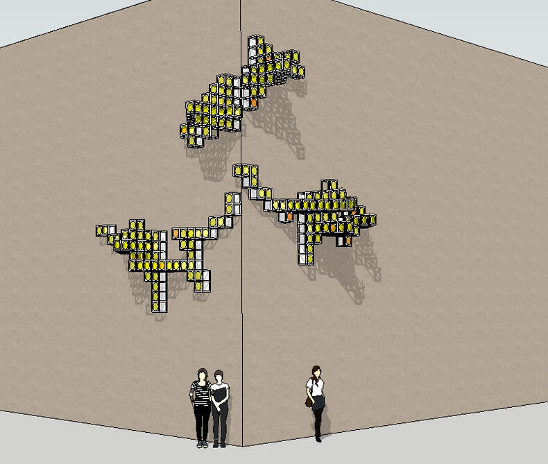 Piirros taideteoksesta, Auringon kulma, joka valmistuu Luonnonmaan perhetalon ulkoseinään.