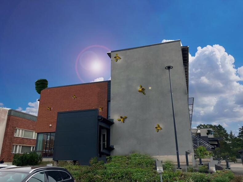 Kalevanniemen kampusrakennukseen tulevassa teoksessa mehiläiset kiipeävät harmaassa ulkoseinässä, mehiläispesä seisoon rakennuksen katolla ja veistetty ihmishahmon pää sijoittuu yhteen ulkoseinään