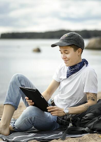 Henkilö lukee rannalla