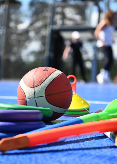 Liikuntavälineitä sinisellä kentällä aurinkoisena päivänä.