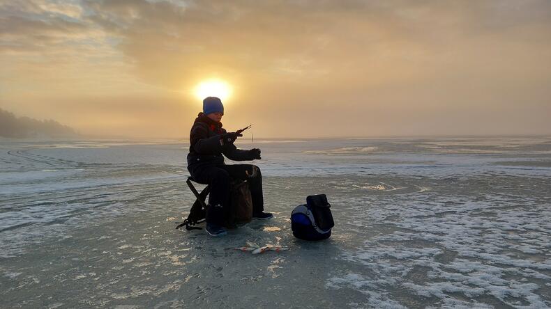 Lapsi pilkkii jäällä, jossa on ahvenia. Aurinko laskee takana.