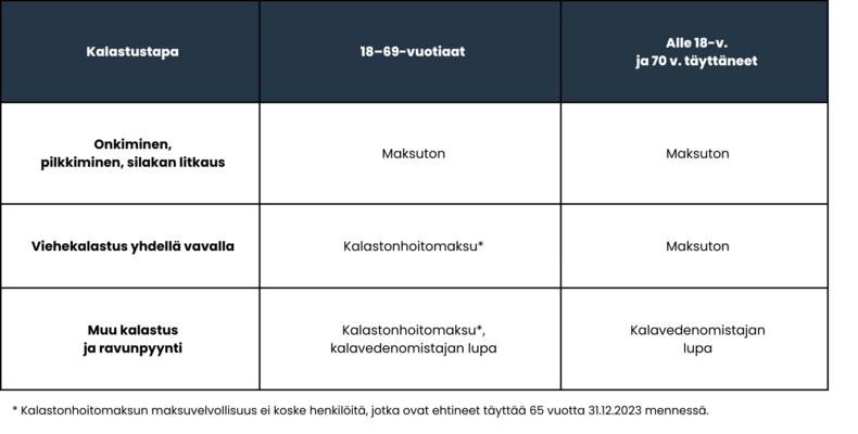 Onkiminen, pilkkiminen, silakan litkaus: 18–69-vuotiaat sekä alle 18-v. ja 70 v. täyttäneet, maksuton. Viehekalastus: 18–69-v. kalastonhoitomaksu*, alle 18-v. ja 70 v. täyttäneet maksuton. Muu kalastus ja ravunpyynti: 18–69-v. kalastonhoitomaksu*, kalavedenomistajan lupa, alle 18 v. ja 70 v. täyttäneet, kalavedenomistajan lupa. * Kalastonhoitomaksun maksuvelvollisuus ei koske henkilöitä, jotka ovat ehtineet täyttää 65 vuotta 31.12.2023 mennessä.