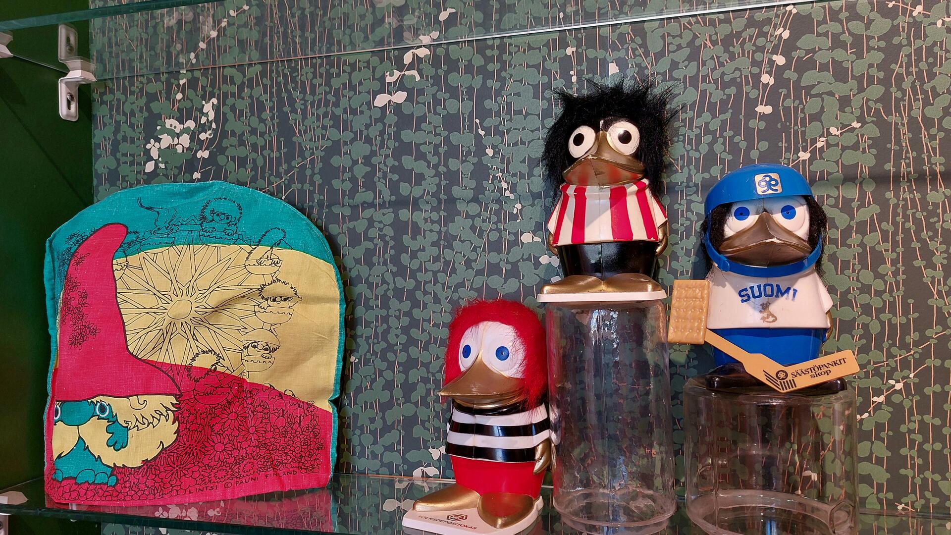 Lasihyllyllä pannumyssy ja peikon muotoisia säästölippaita