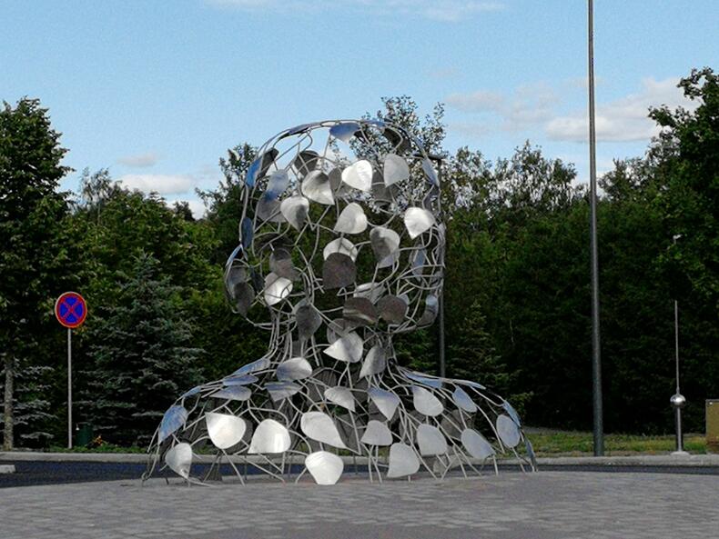 taideteos, jossa metallista tehty runko ja päälle kiinnitetyt lehdet muodostavat naisen rintakuvan