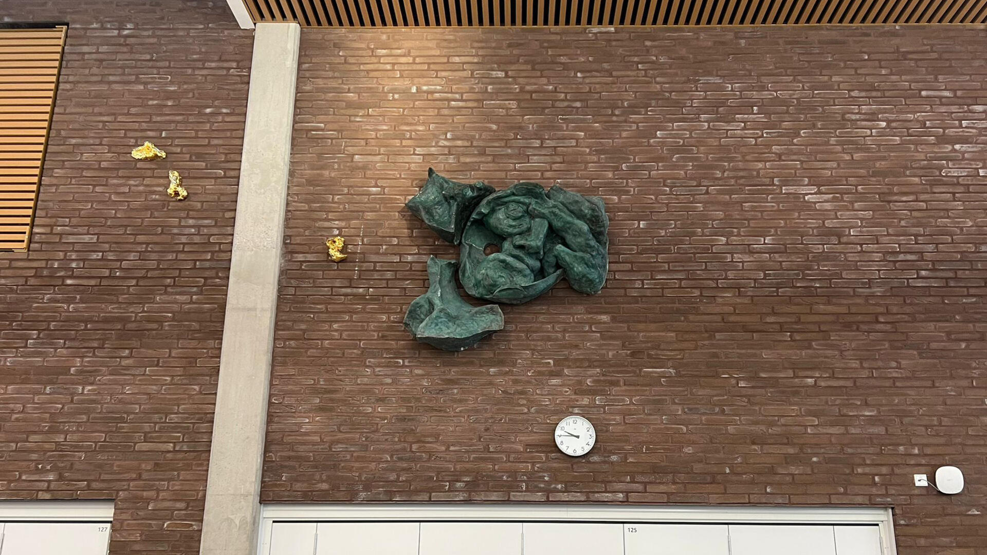 Osa Benjamin Orlowin taideteoksesta Luonnonmaan perhetalossa kiinnitettynä tuloaulan tiiliseinään.