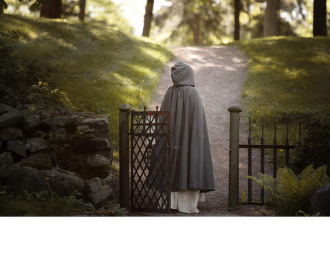 Jenni Haukio raitaan pukeutuneena Naantalin Vanhankaupungin rannassa kädessän Unikeko-kyltti.