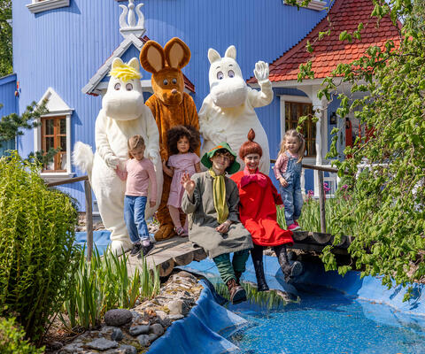 Muumimaailman asukkaat ryhmäkuvassa lasten kanssa Muumitalon edessä.