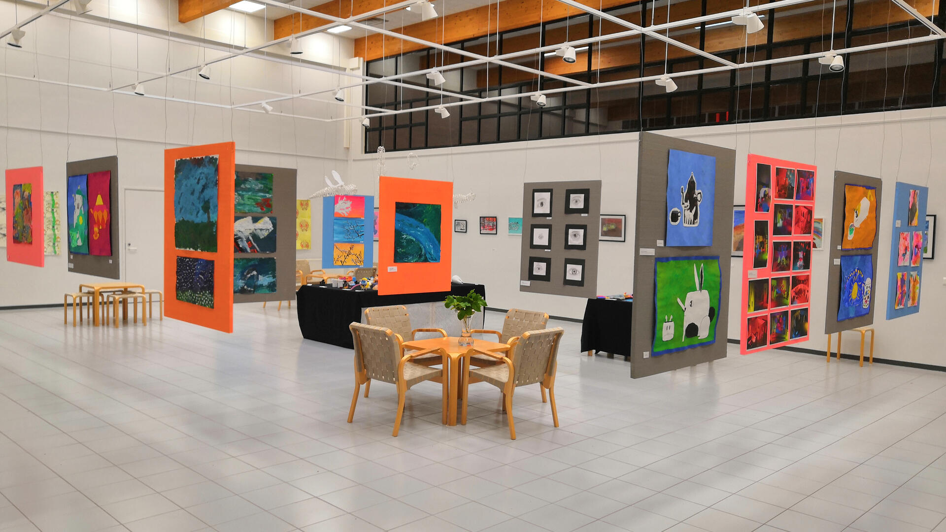 Birgitta-sali, jossa Naantalin opiston oppilastöitä on ripustettu seinille ja roikkumaan katon valaisinkehikosta.