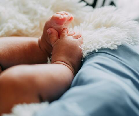 Vastasyntyneen vauvan kippurassa olevat jalat pehmeällä pedillä.