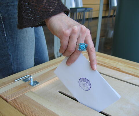Äänestyslippu menossa vaaliuurnaan