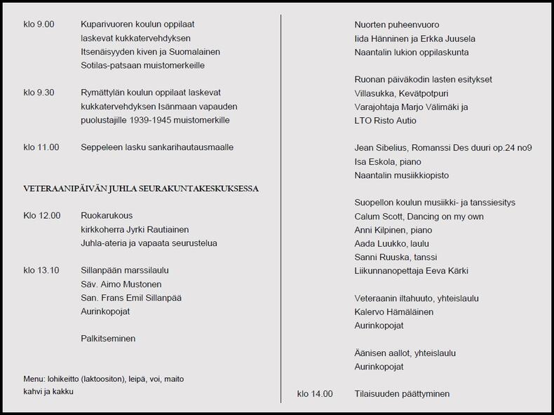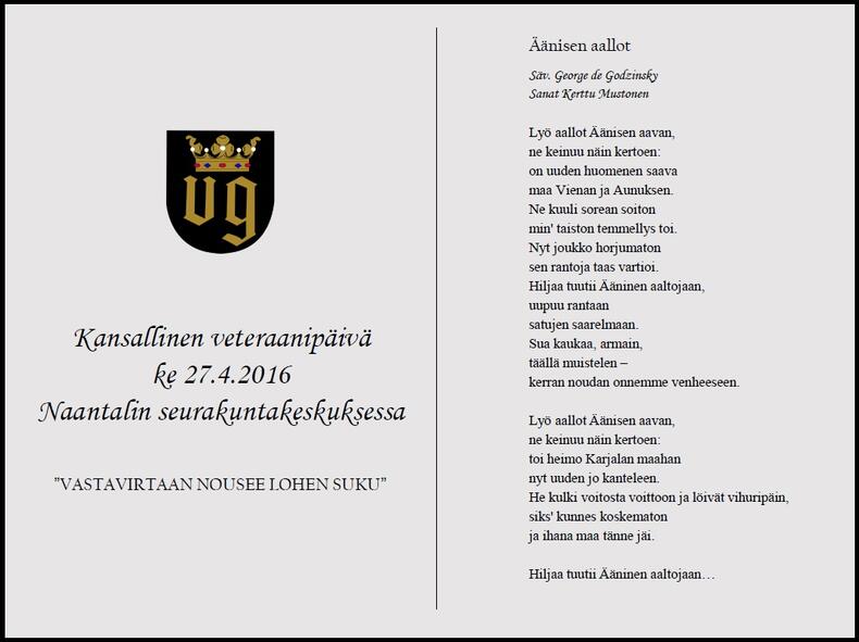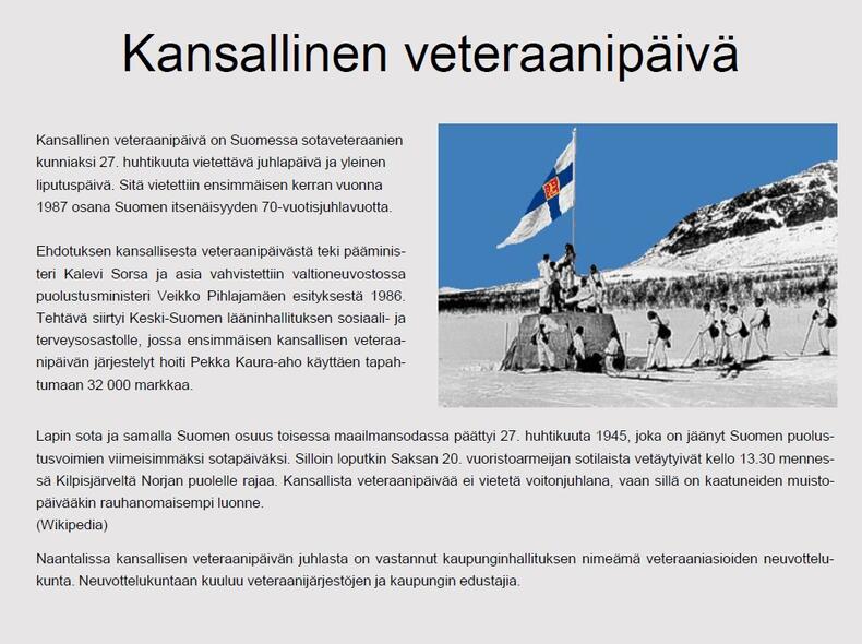 Kuvassa on pitkä teksti veteraanipäivästä ja sotavoimat kantamassa Suomen lippua.