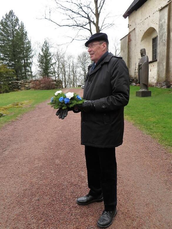 Naantalin seudun Sotaveteraanit ry:n puheenjohtaja Jaakko Ylitalo Naantalin luostarikirkon ulkopuolella.