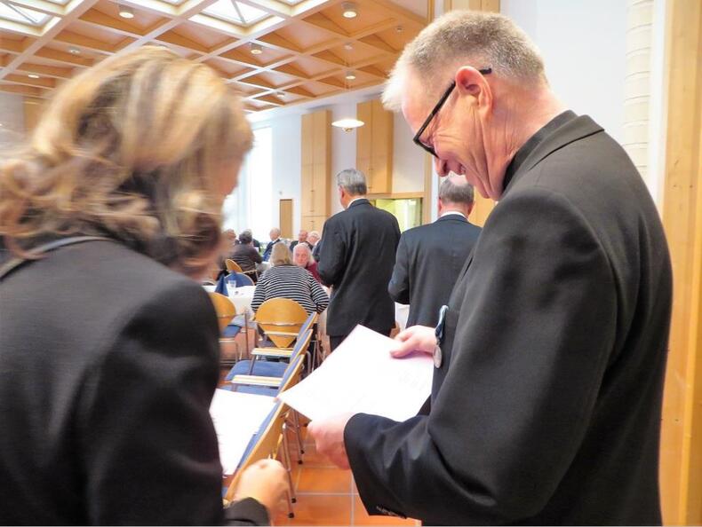 Kirkkoherra Jyrki Rautiainen tutkii juhlatilaisuuden ohjelmaa.