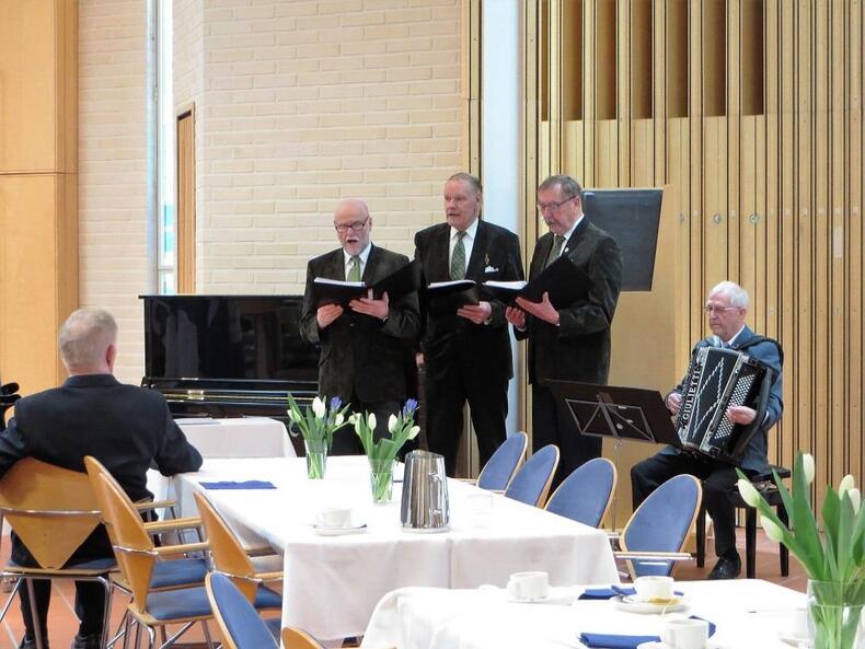 Aurinkopojat: Arto Heilimö, Aimo Lintula ja Rauno Laine esittivät perinteistä sotilasmusiikkia. Harmonikalla säesti Toivo Partanen.