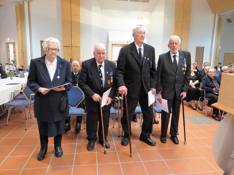 Outi Ahokas, Aarne Toivola, Mauno Ranki ja Karl-Erik Sternberg palkittiin presidentti Sauli Niinistön myöntämillä Suomen Valkoisen Ritarikunnan SVR M 1 –mitaleilla.