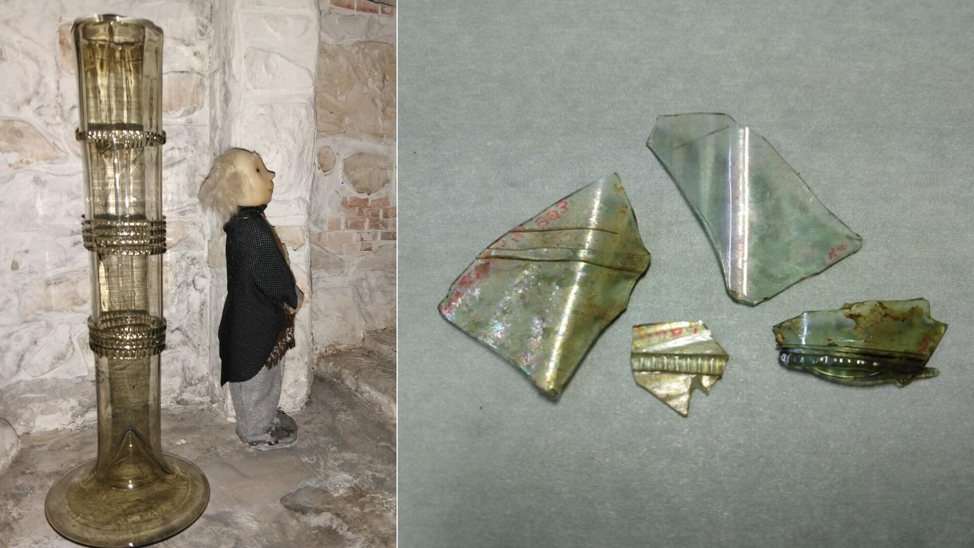 kaksiosainen kuva, jonka vasemmassa puolessa näkyy korkea jalallinen lasi ja pienoismallin vahanukke. Oikealla puolella lasinsirpaleita.