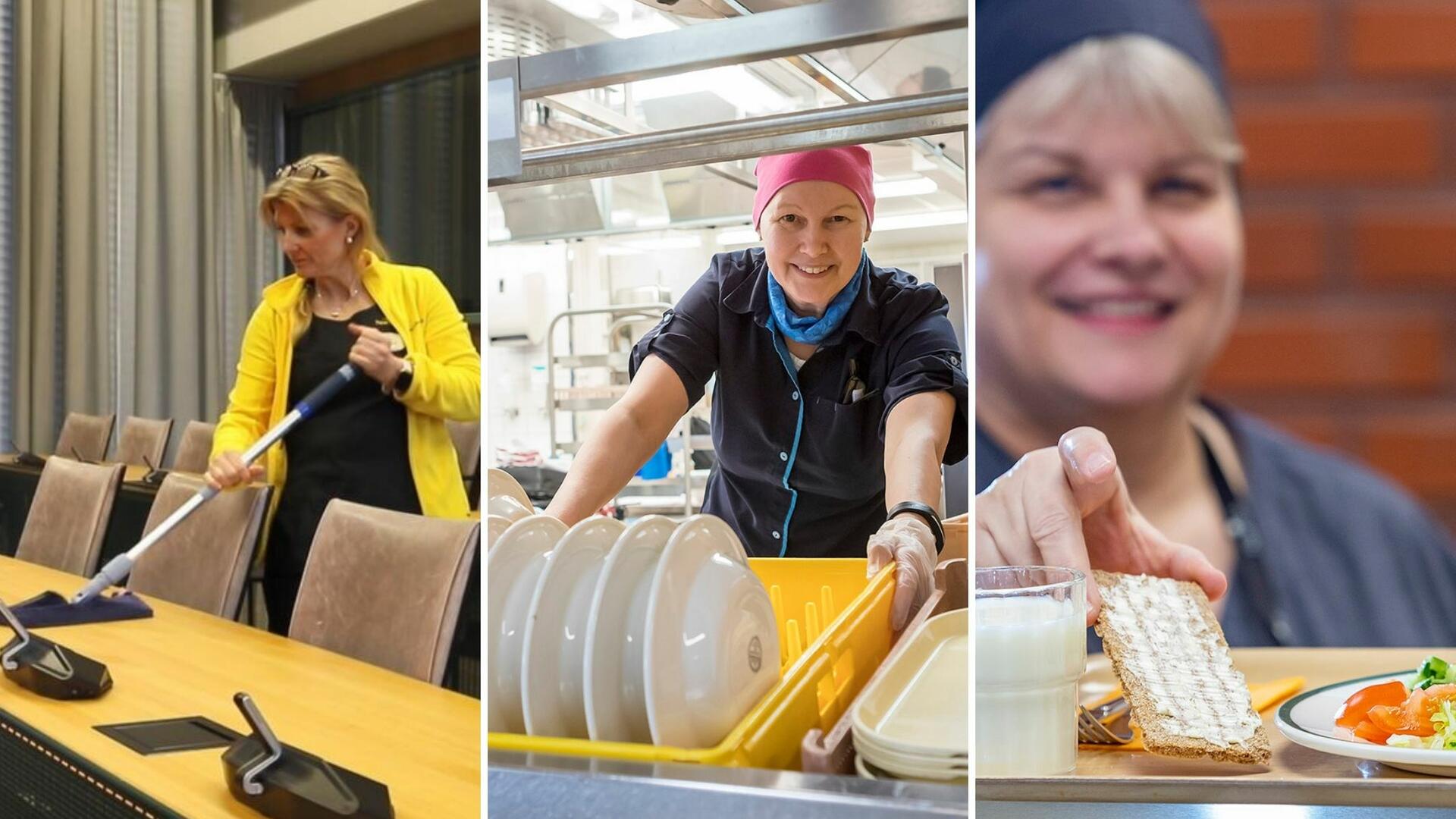 Kolmeen jaetussa kuvassa vasemmalla keltaiseen fleeceen pukeutunut nainen pyyhkii pöytää, keskellä nainen kurkistaa astialinjaston takaa ja oikealla ateriapalveluiden työntekijä asettaa näkkileipää tarjottimelle maitolasin viereen.