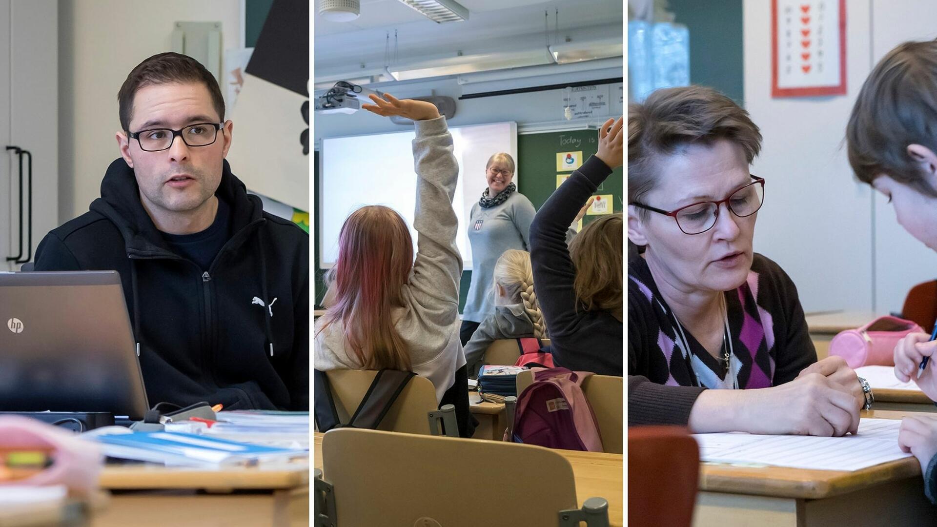 Kolmeen jaetussa kuvassa vasemmalla miesopettaja opettamassa, keskellä opettaja luokan edessä, useat oppilaat viittaavat ja oikealla opettaja auttamassa pulpetin ääressä istuvaa pientä oppilasta.