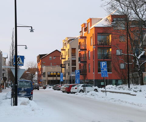 Uusia kerrostaloja Naantalin keskustassa, talvisessa auringonpaisteessa.