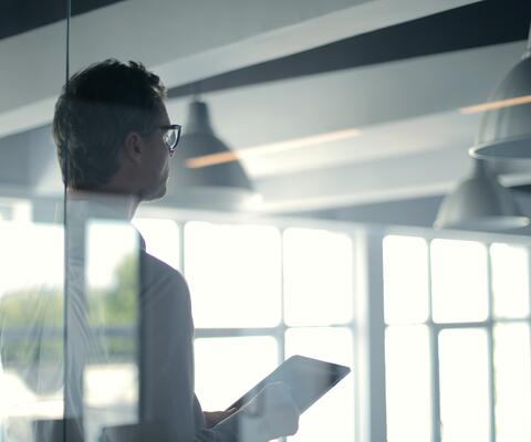 Silmälasipäinen mies seisoo tabletin kanssa lasiseinän takana.