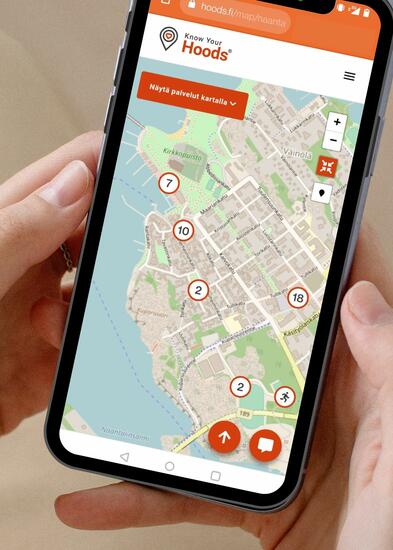 Älypuhelimen näytöllä avoinna Know Your Hoodsin karttapalvelu, jossa naantalilaiset yritykset ovat esillä.